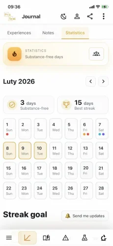 Track your own experiences, usage patterns, notes and reflections — fully offline. Keep note of your sobriety streak and optionally add friends to motivate and support each other.